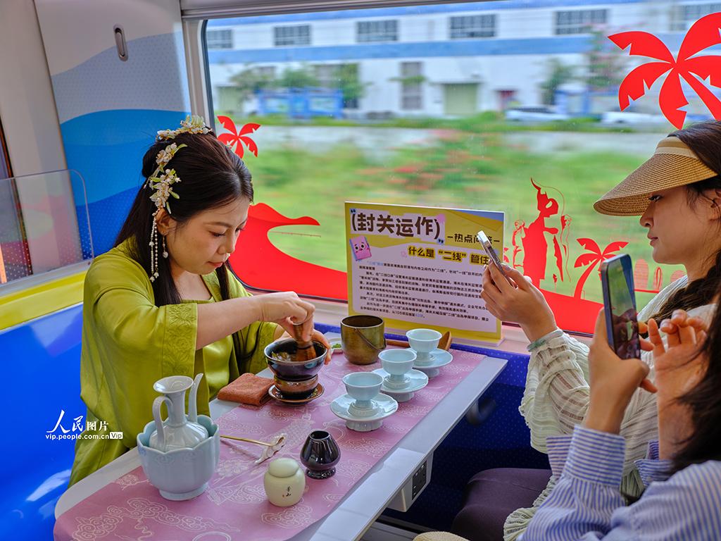 2025年12月10日,游客在海南三亚火车站乘坐“天涯海角”主题列车,欣赏沿途风景。